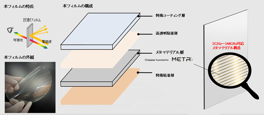 積水化學工業株式會社(代表取締役社長:加藤敬太、以下「積水化學」)的高機能塑料公司(總裁:清水郁輔)使用Meta Materials公司(總部:加拿大,CEO:George Palikaras)的技術成功地開發了世界第一張用於5G通訊的「透明軟性電波反射膜」,透過重新設計Meta Material層,成功地將兼容頻段提高, 適用頻段兼容2Ghz~144GHz, 預計可用次世代的6G通訊也能應用。