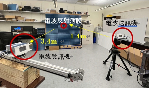 將電波送訓機放置距離反射膜1.4公尺外後, 用距離反射膜3.4公尺的電波受訓機進行反射性能的測試實驗。得證其反射性能與金屬板材相當。